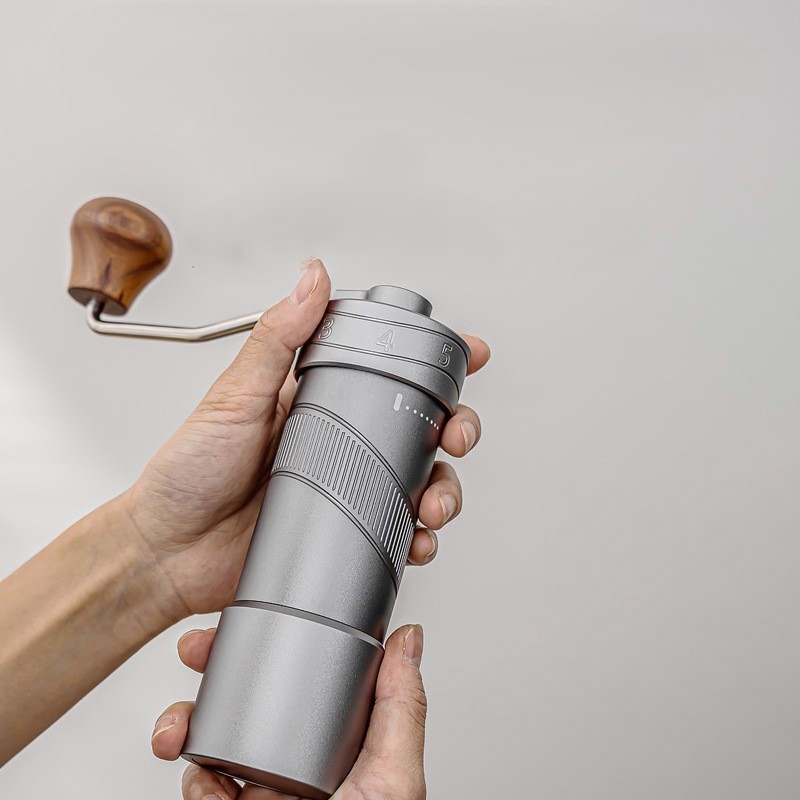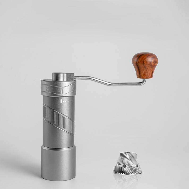 外部挽きサイズダイヤルを備えたステンレス製の手動コーヒーグラインダー。 304グレードのスチールボディ、しっかりとしたグリップのためのローレット加工されたバレル、人間工学に基づいた木製クランクハンドルが特徴です。コンパクト(Ø55×165 mm)で持ち運びが可能で、エスプレッソ、プアオーバー、フレンチプレスなどに極細から粗まで均一な挽き粉を提供します。家庭、オフィス、旅行に最適です。