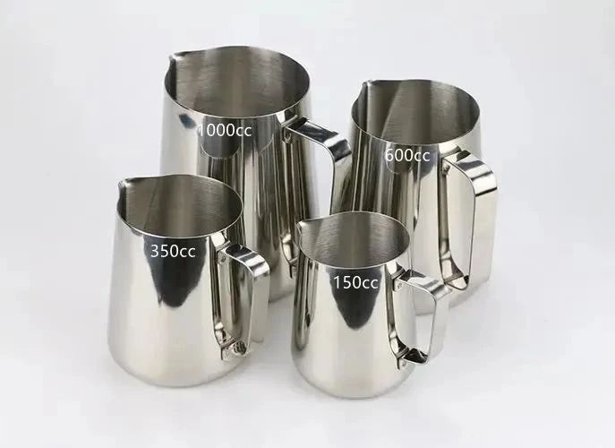 ラテアートカップの容器は、一般的に150cc、350cc、600cc、1000ccに分けられます。ミルクカップは蒸気の量によって容量が異なりますが、スチールカップでは350ccと600ccがよく使われます。